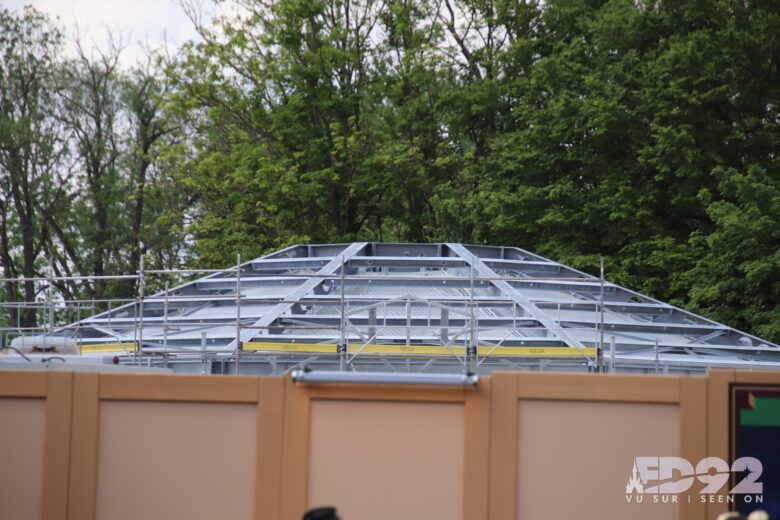 L’attraction commence à prendre du volume avec l’édification récente de sa structure métallique facilement identifiable. Il reste encore à la couvrir et à la décorer dans les prochains mois. La pointe de la structure est visible, pré-assemblée sur le côté. Elle sera prochainement hissée au sommet de la construction. Les travaux au niveau de la file d’attente se poursuivent.