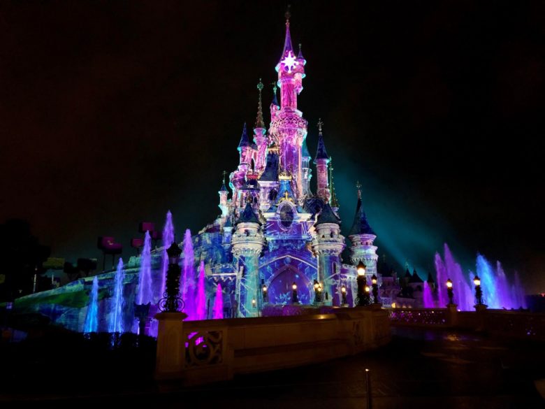Disney Illuminations prend fin et, une fois encore, le parc nous laisse dans l’expectative. Heureusement, cette fois-ci l’attente est moins longue et le spectacle redémarre bien plus rapidement. Les premières notes de Rêvons… et le monde s’illumine ! résonnent et le château se pare de scintillements. Les jets d’eau se réaniment… Tout ça me rappelle quelque chose… Le mapping est quasi identique à la première partie et apparaît même beaucoup moins dynamique. Le changement réside dans la chanson qui l’accompagne. Entraînante et joyeuse, comment ne pas la chanter à tue-tête ? Certains s’essaient même aux pas de danse.