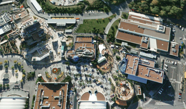 Le temple du shopping “World of Disney” apparaît sur les images aériennes suite à son ouverture le 12 juillet 2012. Idéalement situé à la sortie des deux parcs, il devient un passage obligé en fin de journée. Son emblématique demi globe terrestre se distingue particulièrement lorsqu’on prend de la hauteur.