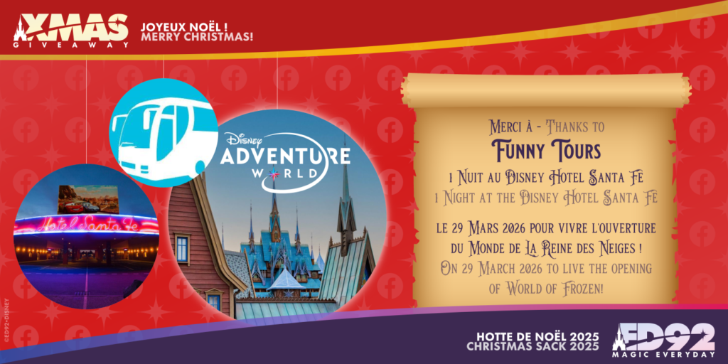 Pour participer au concours sur notre page Facebook et tenter de remporter 1 nuit au Disney Hotel Santa Fe, le 29 mars 2026 pour l’ouverture de World Of Frozen avec Funny Tours.