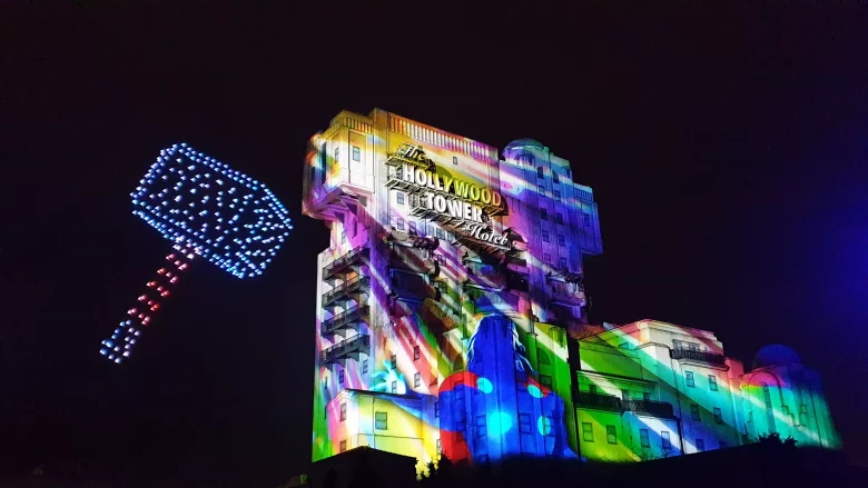Following F.R.I.D.A.Y.’s briefing, Doctor Strange, master of the mystic arts, opens the aerial ballet of drones revealing the full potential of his powers just before the Hulk comes to steal the show in an explosion of anger and pyrotechnic effects. This is followed by the appearance of American national hero Steve Rogers aka Captain America and his sky-launched shield. From the shield to Thor’s MjΓΆllnir there is only one step or rather a few hundred drones. The short-handled hammer blasts the surroundings of The Twilight Zone Tower of Terror. As for the mischievous Loki, he is never far awayβ¦