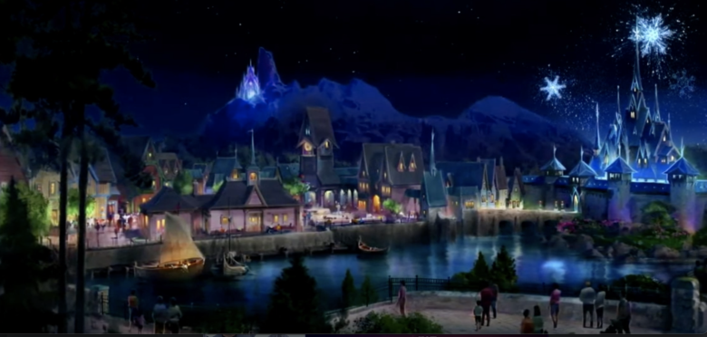 Behind the cranes and construction machinery mobilised for this development, the Kingdom of Arendelle is beginning to take clear shape, with the first themed facades of the village and the base of the castle, as well as the snow-capped mountain that will serve as the iconic backdrop to this universe. New concept art revealing the atmosphere of the area at nightfall has been revealed for the occasion.