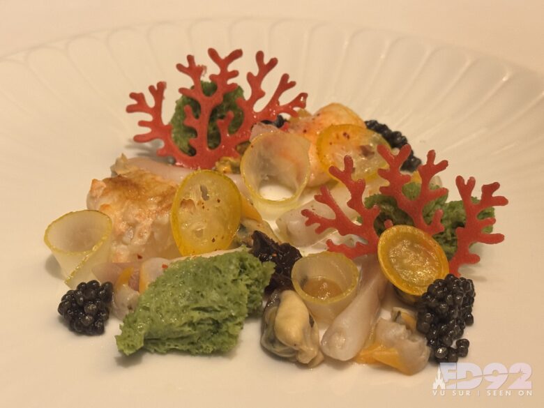 🌊 Sous l’Océan : Plat élégant avec deux langoustines, trois moules, excellente sauce verte aux agrumes et caviar en quantité assez généreuse ( variante sans caviar dans le menu découverte). Un élément de sponge cake sans grand intérêt gustatif, assez insipide. Plat visuellement époustouflant. (9/10 – Menu Dégustation)
