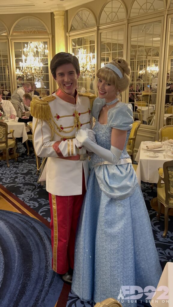 Le repas se déroule avec la rencontre des princesses et leurs princes. Ils viennent aux tables et prennent le temps avec les gens ce qui est agréable. Nous n’avons pas du tout l’impression d’être pressé. A un moment donné, nous avons eu un problème d’appareil photo lors des photos avec Belle et son Prince. Ils ont tous les deux accepté de refaire les photos sans problème.