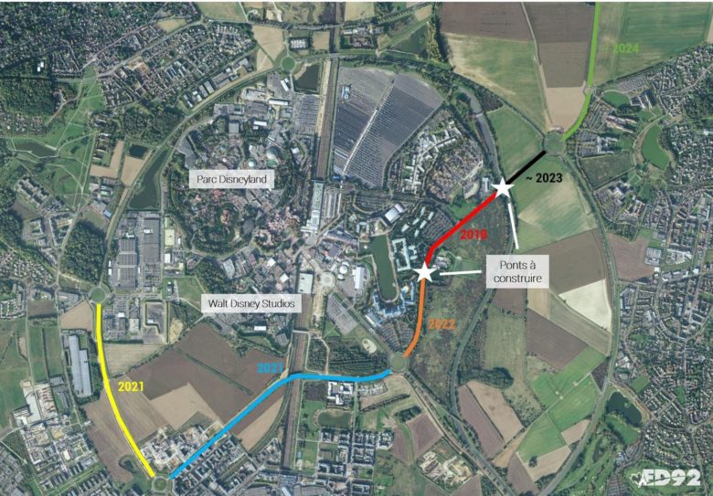 Afin d’accueillir davantage d’habitants et de touristes (hors crise sanitaire) dans des conditions optimales, l’aménageur de Marne-la-Vallée a entrepris depuis quelques années des travaux de doublement des voiries sur des axes stratégiques tout autour de Disneyland Paris en lien notamment avec l’extension du Walt Disney Studios Park.